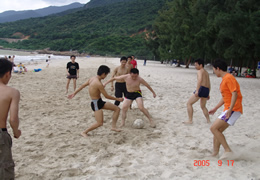 一到海灘,員工們便象激情的小鳥,沖向銀色沙灘,投入到碧海的懷抱。一時間,沙灘排球、沙灘足球、沙灘“家家”活動此起彼伏,好一個歡樂祥和、返璞歸真的溫情世界。“明月出天山,蒼茫云海間”,42名員工都成了這一靚麗風景的元素。