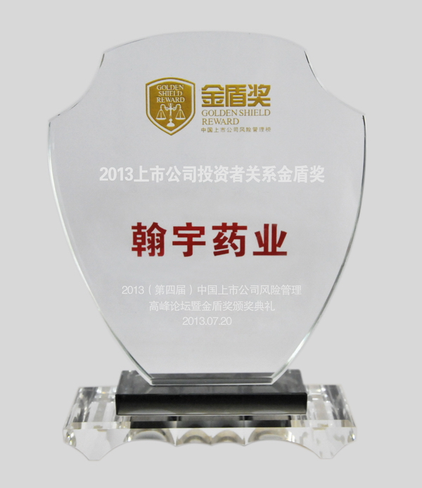 7月20日,2013中國上市公司風險管理高峰論壇暨第四屆金盾獎頒獎盛典在上海舉行,翰宇藥業憑借卓越的風險管控能力榮獲“2013中國上市公司投資者關系金盾獎”。