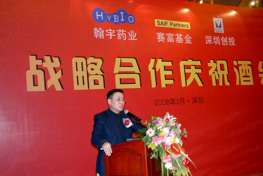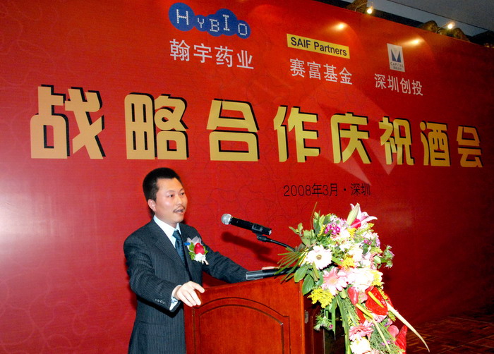 2008年3月7日,深圳翰宇藥業(yè)股份有限公司與軟銀賽富亞洲投資基金管理公司、深圳市創(chuàng)新投資集團有限公司在深圳隆重舉行“戰(zhàn)略合作慶祝酒會”,來自醫(yī)藥、金融、證券、新聞、以及參與三方合作等單位的嘉賓 100多人參加了此次慶祝酒會。