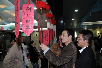 這次晚會會場的布置別出心裁,主格調(diào)采用了藍色的軟紗,幔簾之間還裝飾了五彩的氣球;大廳中間擺放的是許愿樹,掛滿了同事們對來年的愿望和對親友同事的祝福;兩邊的拱門懸掛著用于猜燈謎的紅燈籠。中西合璧的自助餐的方式,隨意自在,活潑熱烈。晚會還產(chǎn)生了80多名幸運員工,曾少貴董事長還親自為一等獎獲得者頒獎,晚會在歡呼聲和掌聲中劃上了圓滿的句號。