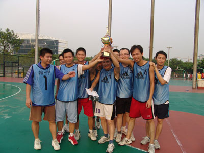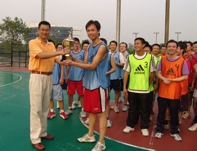 經過一小時緊張激烈的角逐,最后一聲長哨響起,比賽在啦啦隊的歡呼聲中結束。在頒獎儀式上,袁總為冠軍獲得者研發聯隊頒發冠軍獎杯和獎金。全總為客戶肽聯隊頒發亞軍獎金,同時還為李益文頒發“得分王”獎品。