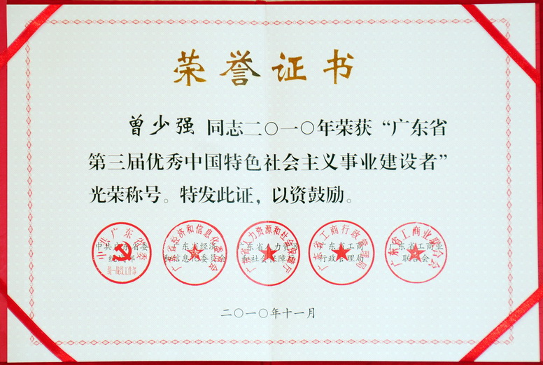 曾少?gòu)?qiáng)副董事長(zhǎng)榮獲“廣東省第三屆優(yōu)秀中國(guó)特色會(huì)主義事業(yè)建設(shè)者”榮譽(yù)稱號(hào)
